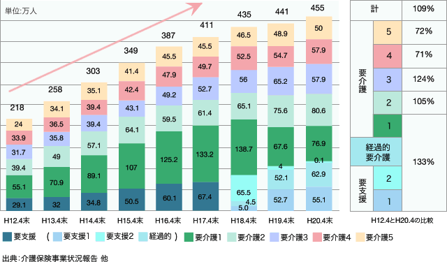 要介護者も年々増え、平成20年4月には455万人となっています。